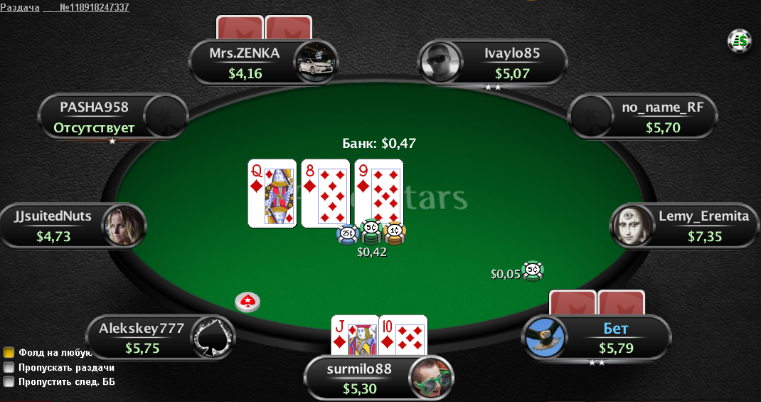 Поэтому, получив приличную прикупную комбинацию на флопе, тщательно обдумайте, делать ставку или чек.