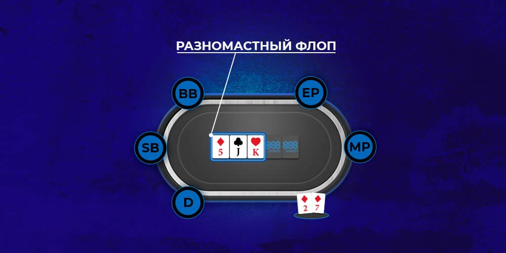 Стратегия для разномастного флопа с мелкими картами подобна той, которая используется для флопа с 1-ой высокой картой, но мелкие и средние пары всегда для оверкарт более уязвимы. Вероятность стрит-дро у кого-нибудь из игроков возрастает.