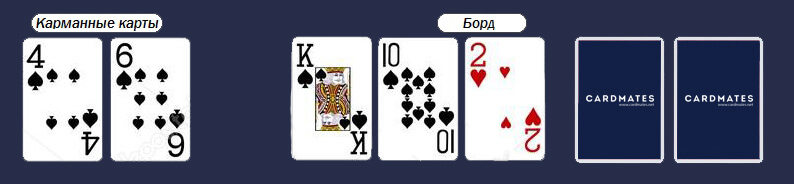 Существует несколько случаев, когда на стадии флопа правильнее всего ответить чеком, например, когда вы уверены на 100%, что не имеете лучшую руку и вам ответят на ваш бет. Обычно так и случается, если играет несколько противников, а на флопе три близкие по рангу карты или пара одинаковой масти. Наглядный образец: