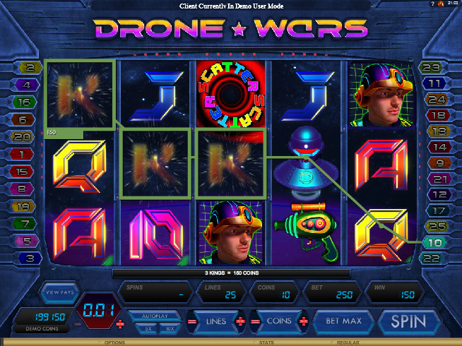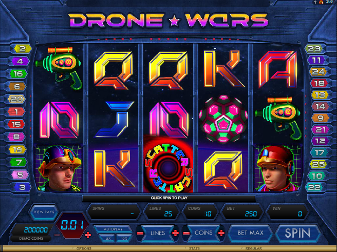 Отвлечемся ненадолго от Второй Мировой войны. Военную тему продолжает фантастический слот Drone Wars. Война Дронов это пятибарабанный непрогрессивный слот, с 25-ю линиям выплат от Microgaming. В нём есть дикий символ, рассыпной символ и символ бесплатных вращений, а также максимальный джек-пот в размере $4,000.