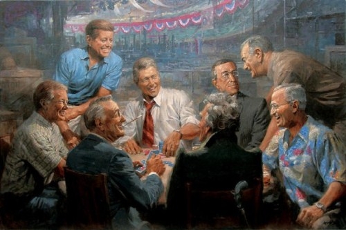 Немного перескочим и поговорим о тридцать третьем президенте Америки – Гарри Трумэне. Этот президент также сильно увлекался азартными играми, предпочитая всем остальным карточным вариантам именно покер. К временам его президентства популярность покера набрала обороты. Любовь к покеру была привита Гарри отцом, который был великим картежником, способным поставит на кон все свои сбережения, и не только свои, но и семейные, включая дом и владения. Однако подобное неразборчивое и бездумное азартное пристрастие к игре стало губительным, и отец разорился. Но и подобный исход не отнял у отца любви к покеру. Даже сын не сделал никаких выводов, заставивших его бросить покер. После того как Гарри Трумэн не поступил в университет, так как нечем было платить за обучение, он последовал примеру отца, попытавшись построить бизнес на занятые деньги. Несколько тысяч долларов были вложены в цинковое месторождение, еще пять тысяч долларов легли в развитие нефтяной компании. Однако все начинания будущего президента не давали никакой прибыли и были сведены на нет. Уже после того, как Трумэн отслужил в армии, он открыл галантерейное дело совместно со своим товарищем, который, также как и Гарри, любил покер. Но и это начинание не дало плодов, через два года бизнес прогорел. Но Гарри был невероятно азартным человеком, и готов был «играть», пока не выиграет! И выигрыш в итоге не заставил себя долго ждать. Трумэн нашел себя в политике. По совету своего армейского друга, заведовавшего азартными играми, проституцией и наркотиками, Гарри пошел в политику, чтобы прикрывать сверху нелегальный бизнес товарища. Деньги, вложенные в будущего политика, и продвижение Трумэна к вершинам славы, дали свои плоды. Уже при президентстве Франклина Рузвельта, Трумэн становится вице-президентом, а после смерти Рузвельта и вовсе становится во главе правительства США. И тогда, как и раньше, именно покер становится единственным способом расслабления и отдыха после тяжелого рабочего дня. Совместно со своими друзьями по вечерам в стенах Белого дома они играют в покер, а в выходные устраивают игры в покер на президентской яхте – самом любимом месте для игры в покер. На игру приглашались только самые близкие президенту люди, ставки начинались от 500 долларов. Интересно, что фишки, которые использовались в игре, имели на себе именную президентскую печать.
