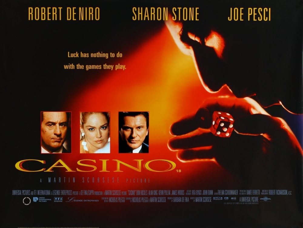 Главные роли в нем исполнили всеми нами любимые актеры - Роберт Де Ниро и Шэрон Стоун. А сам слоган фильма может служить и слоганом всем азартным играм, и звучит он, как - «Риск. Власть. Искушение.». Мир Лас-Вегаса, казино и водопад денег, что льется в карманах гангстеров.