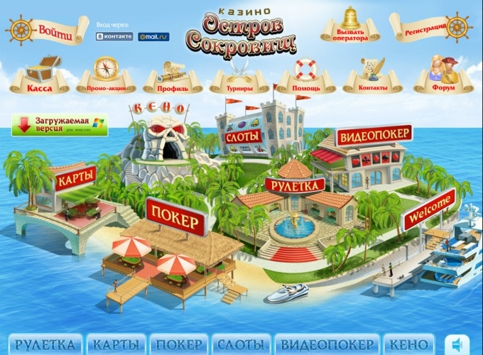 Карта онлайн казино оформлена в виде острова, на котором вы сможете найти игру на свой вкус. Здесь представлено множество азартный игр, таких как: