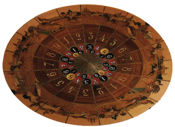 На самой чаше находятся 36 ячеек с номерами от 1 до 9. Черным цветом окрашены цифры 1, 3, 6, 8, а красным цифры - 2, 4, 7, 9. Ячейки с цифрой пять желтого цвета, и играют роль зеро. На игровом поле нанесены поля для ставоки на равные шансы, и на номера.