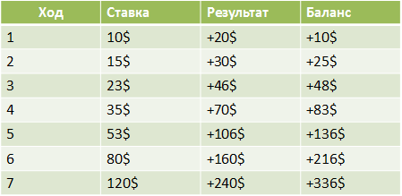 Основная задумка данной стратегии очень проста. Если вы выигрываете, то вам нужно следующую ставку делать равную предыдущей и еще половине прошлой ставки. К примеру, если вы поставили и выиграли 20$, тогда следующая ставку будет равняться 20$ (20$+20$*1/2). В противном случае, если вы проиграете. То вернетесь к изначальной ставке. А что делать, когда ставку на два нельзя разделить? К примеру, необходимо, чтобы ставка приравнивалась 15 + 15*1/2. В таком случае сумму нужно округлять в большую сторону.