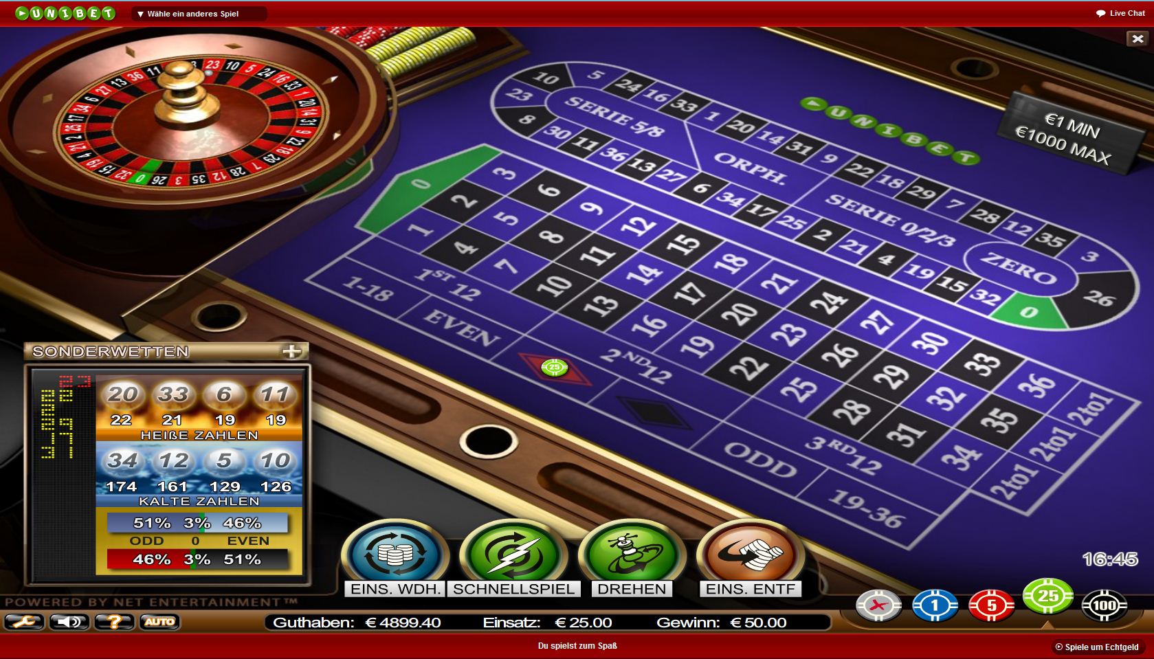Гарантировано выиграть в рулетку можно порядка десять, пятнадцать единиц, следуя методу Рента. Ставки в игре ставятся на равные шансы – это «больше» - «меньше», «красное» - «черное». Главным врагом в игре является выпадение сектора 0 (зеро).