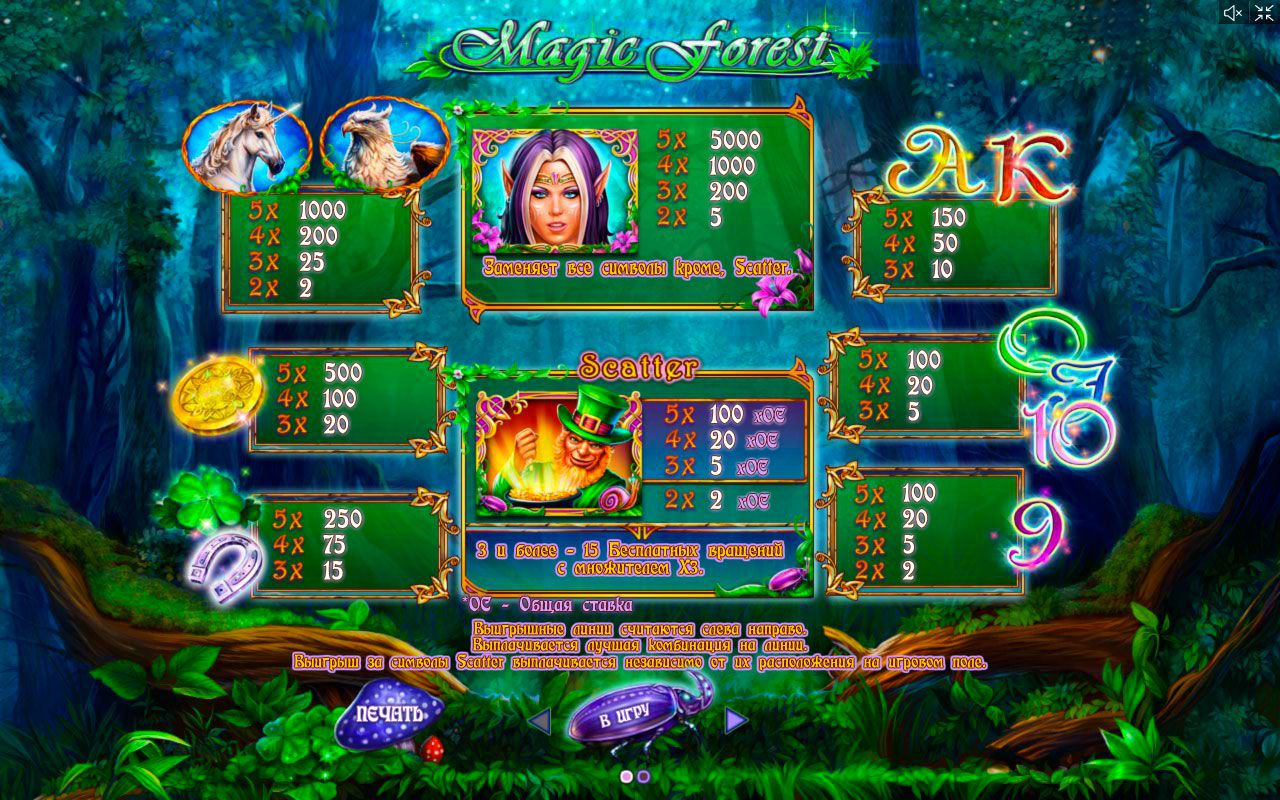 "Magical Forest" – это трехмерный пятибарабанный видео слот с тридцатью активными линиями. Эта игра непременно придется по вкусу тем, кто увлекается фантастикой, мистикой, кому нравится атмосфера волшебства.