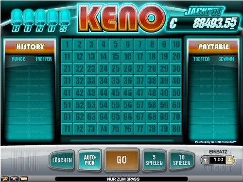 Автомат Кено от компании PlayTech наиболее популярен среди любителей этой игры. Точное название его звучит как Keno Fortune. Он есть во всех известных казино, таких как Casino Titan, Casino Tropez, Lotos Casino, Europa Casino и т.д. Минимальная ставка равна 1 доллару, а максимальная – 100. Игроку можно выбирать не более десяти чисел. При определенном раскладе ставка в один доллар может принести 10 тысяч. На данном автомате есть несколько полезных функций, которые делают процесс игры еще проще. Например, если вы нажмете клавишу «Рандом» программа в случайном порядке выберет числа за вас. Если вы не хотите менять выбранную вам комбинацию несколько раундов подряд, воспользуйтесь опцией «Пять игр».