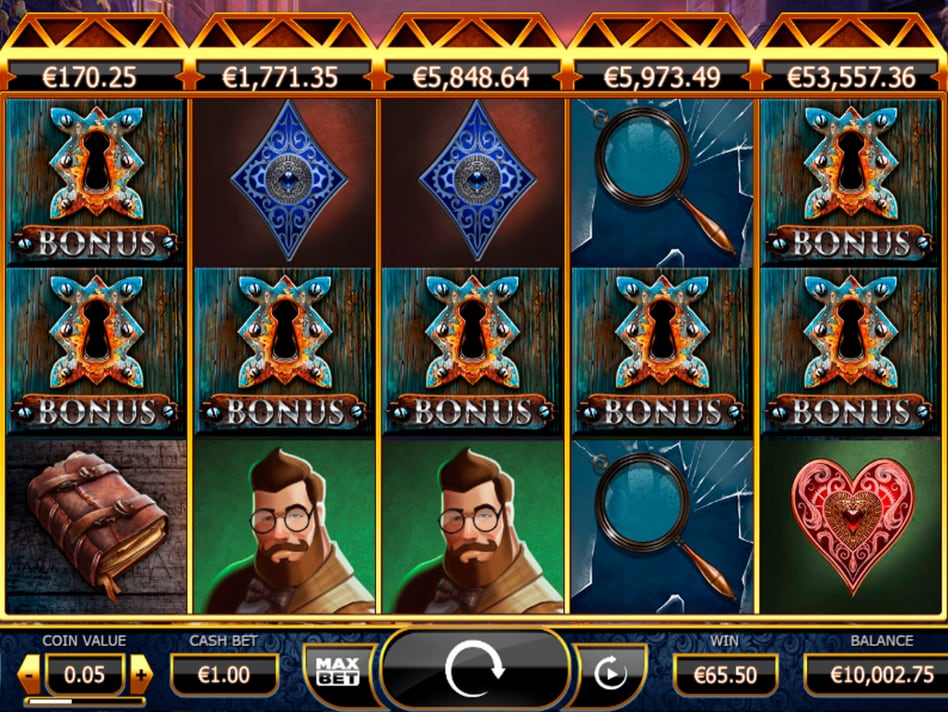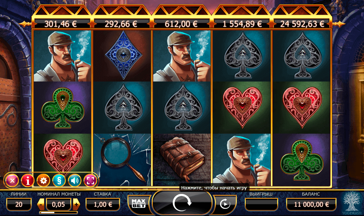 Среди таких выигрышных символов находится и сам Шерлок, присутствие которого на линии принесет максимальный выигрыш в размере 5000 ставок.