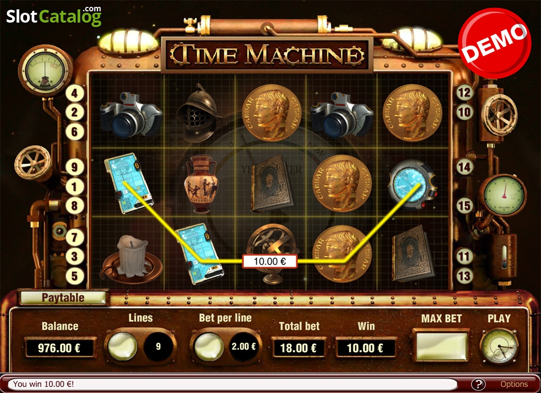 Красочный дизайн является не единственным отличием игрового аппарата Time Machine. Ко всему, он еще очень функционален, поскольку в слоте присутствуют дополнительные бонусные символы и игры, которые стоят наряду с двадцатью игровыми линиями, гарантирующими выигрыш участнику.
