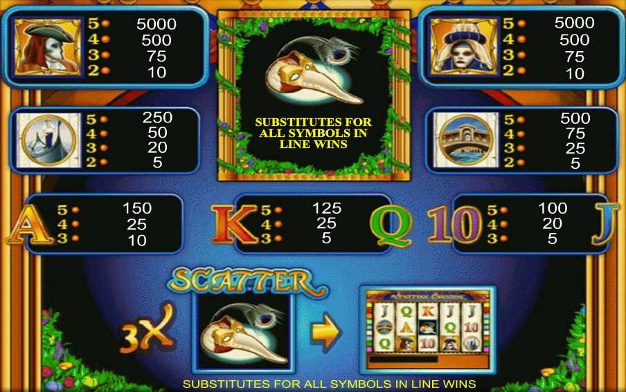 Игровой автомат Venetian Carnival, выйдя в свет, стал одним из излюбленных игр среди насыщенного колорита игровых автоматов, посредством своих игровых качеств и увлекательной, хотя и не похожей на другие, бонусной игре.