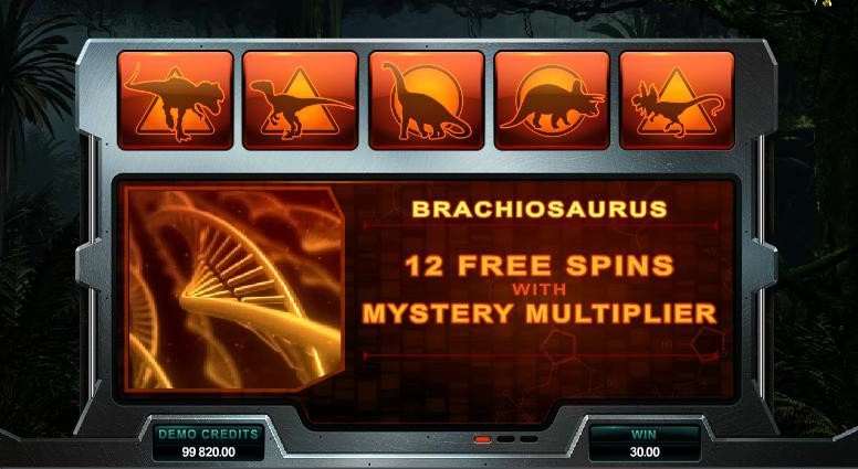 Всего есть 5 режимов бесплатной игры, которую вы можете активировать в этом игровом автомате, и каждая из них названа в честь разновидности динозавров: Тираннозавр-Рекс, Велоцираптор, Трицератопс, Брахиозавр, Дилофозавр. Все они разные: некоторые бонусные игры бесплатных вращений дополнены опциями множителя и возможностью раздваивания диких символов (в бонусной игре Велоцираптора). Другие используют бегающие дикие символы во время бесплатных вращений (в бонусной игре Трицератопса) или оснащены дополнительными дикими символами (в бонусной игре Дилофозавра). Интригу добавляет еще и мистический мультипликатор в бонусной игре Брахиозавра. Но самой необычной опцией оснащена бонусная игра Ти-Рекса, в которой дикие символы могут покрыть все барабаны. Не в каждой игре можно найти 35 дополнительных диких символов! От такого обилия опций захватывает дух, и каждую хочется попробовать, что добавляет слоту играбельность. Ну а динозавры, которые периодически мелькают на экране, пока крутятся барабаны, вносят дополнительные очки в пользу этого слота.
