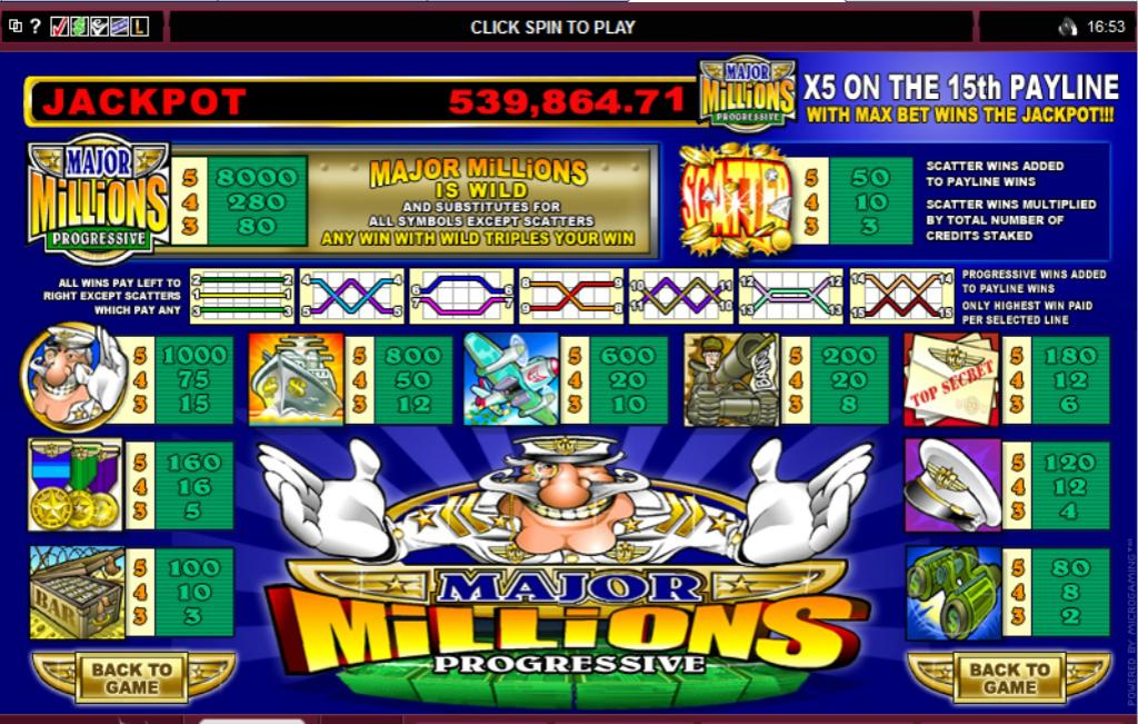 Major Millions считается первым прогрессивным игровым автоматом, за что он и получил свою известность. В мае 2002 г. этот слот осчастливил одного из своих игроков миллионом долларов. Правда, это не единственный подобный случай в истории этого слота-долгожителя.