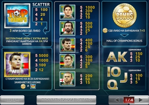 Оплачиваемые комбинации состоят из портретов выдающихся звезд мирового футбола. Среди преимуществ этого слота можно выделить наличие бесплатных игр, инновационной игры на риск и золотого раунда под названием «Чемпионский бонус». Бонусные игры игрового автомата Звезды мирового футбола 2014 радуют!