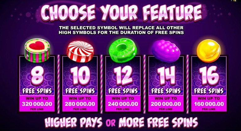 Слот может быть не так увлекателен на первый взгляд, но это не так. Игра затягивает, анимированные символы делают игру более интерактивной. Здесь вы также выбираете бонусную игру бесплатных вращений (максимальное количество спинов – 16) и также есть опция «еще больше», только называется она в данном случае «Еще больше конфет». Символы леденцов делятся, и могут вознаградить игроков выигрышной линией с 25 символами, что кроме гор леденцов, даст вам кучу монет.
