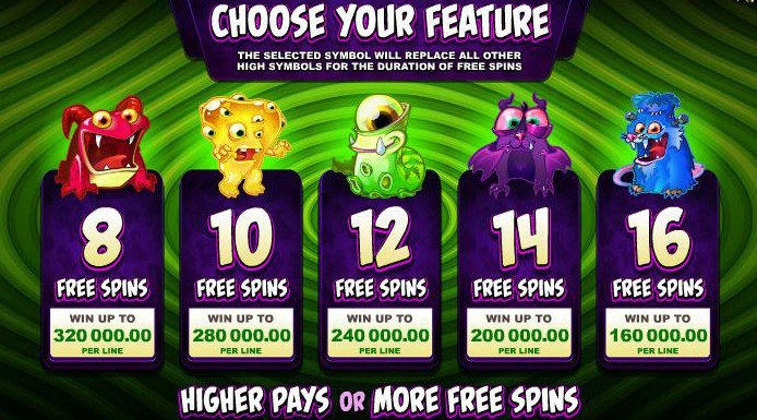 Бонусную игру можно выбрать и не глядя на внешний вид монстра, а оценивая исключительно потенциал выигрыша. Вам предложат от 8 до 16 бесплатных вращений, но не стоит обольщаться, что 16 бесплатных вращений даст вам больше призов, чем 8 спинов, потому что меньшее количество спинов снабдили здесь бОльшим потенциалом. Это, пожалуй, единственное отступление от принципа, принятое в этой игре: «Чем больше, тем лучше». Выбор большего количества вращений, снижает ваш потенциал выигрыша.