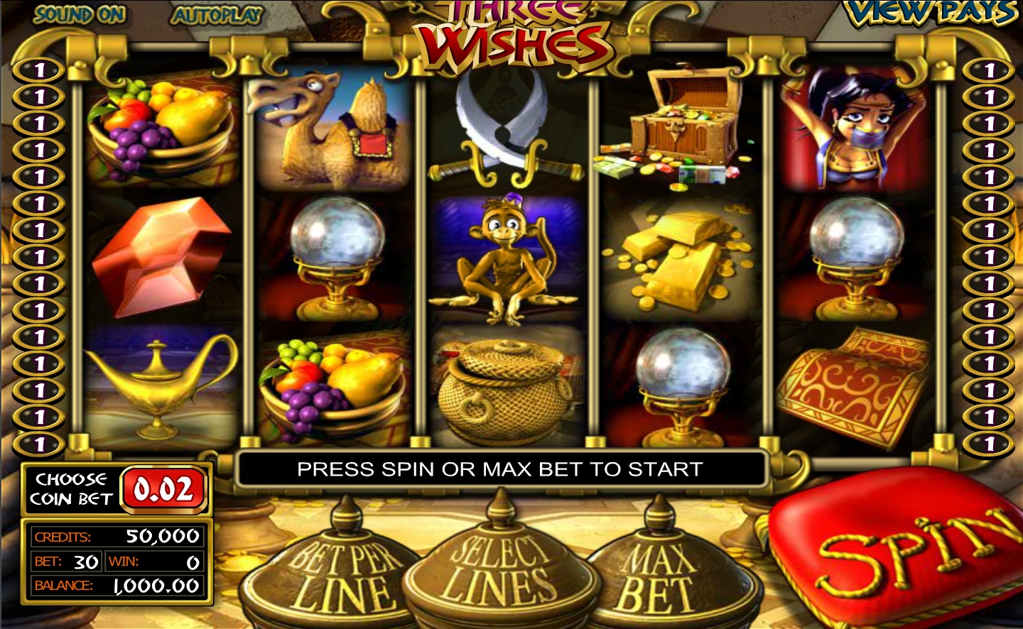 Игровой автомат Three Wishes от компании Betsoft весьма популярен, но игрокам нужно знать, что ловить выигрышные комбинации реальнее на первой линии, реже – на пятой.