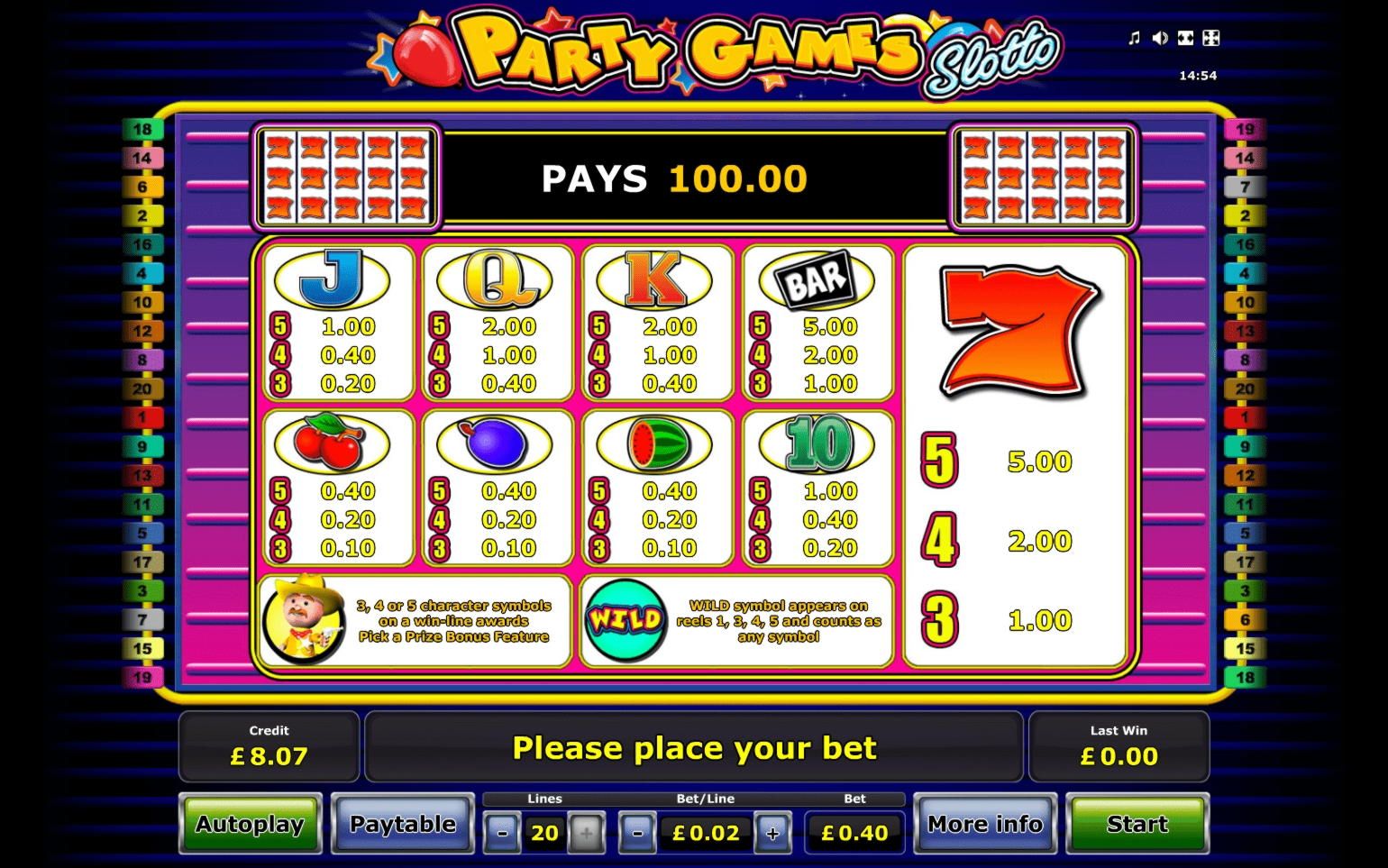 Игра обеспечит вам удобное управление, отличные выигрыши, прекрасное оформление, интересные бонусы. Не упустите свой шанс испробовать Party Games Slotto. Нажимайте на Start и приготовьтесь отлично провести время!