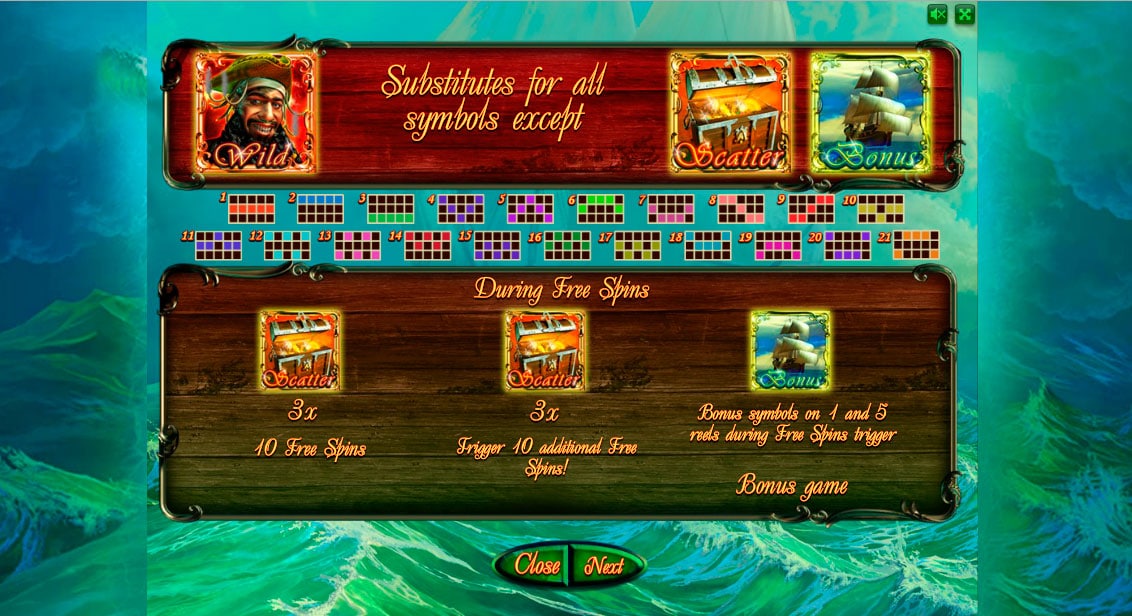 Открыть бонусную игру в этом слоте – задача не из самых простых. Чтобы она началась, на первом и пятом барабанах во время бесплатных вращений должен выпасть символ с изображением пиратского корабля с черными парусами.