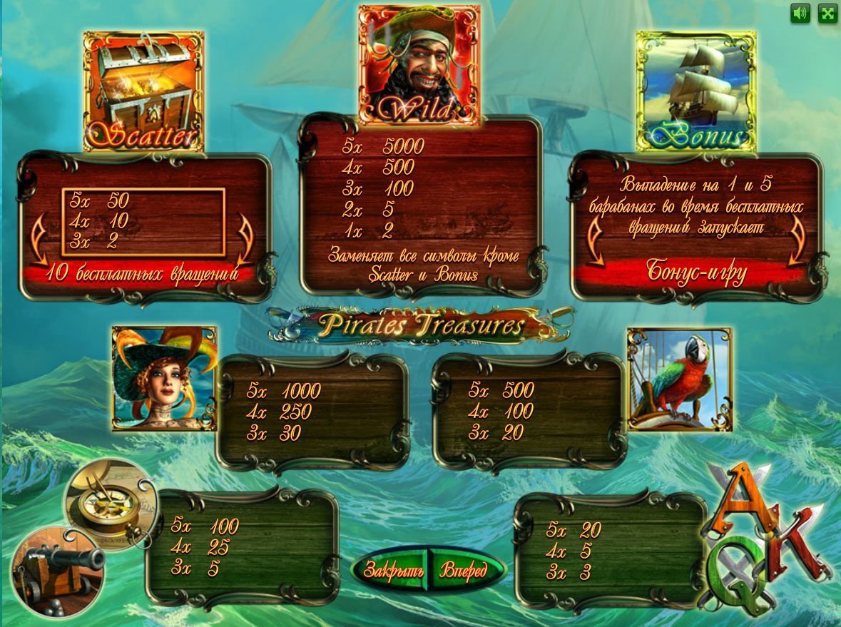 Поможет увеличить Ваш выигрыш и подобрать выигрышную комбинацию символ Wild с изображением главного человека на корабле – капитана. Этот символ заменит в игре Pirates Treasure любой, кроме Scatter.