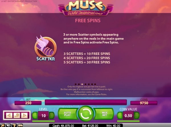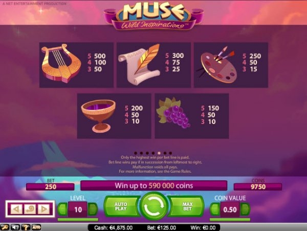 Программистов из компании "Net Entertainment" вдохновили на создание игрового интерфейса слота Muse: Wild Inspiration мифы древней Греции, в которых музы - это девять дочерей верховного бога Зевса и Мнемосины, отвечавшие в пантеоне за различные виды искусств и наук.