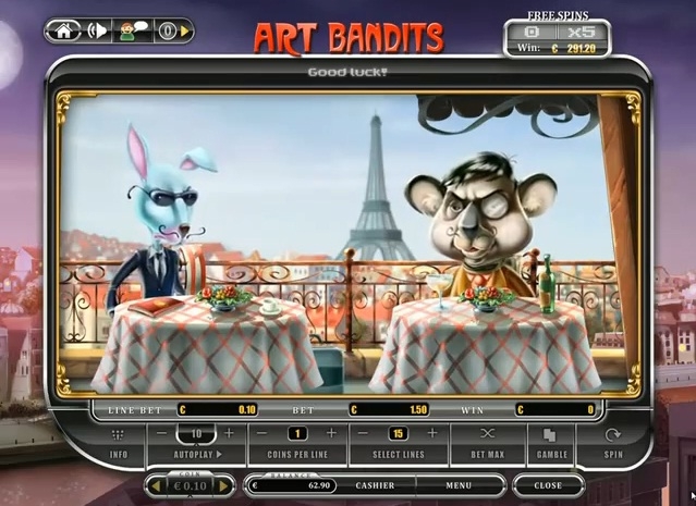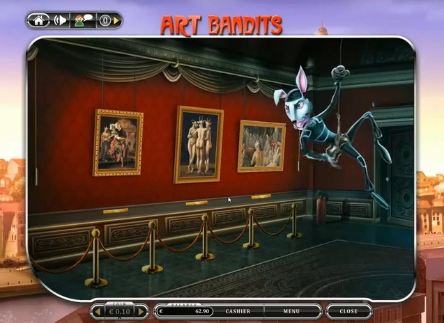 Игровой аппарат Art Bandits состоит из 5 барабанов, связанных 15 линиями. Автомат был создан всемирно известной компанией Oryx Gaming. Тема игры крутиться вокруг перспективного ограбления и не менее успешных главных героев: усатого зайца, хитрой лисы и енота-технаря.