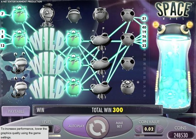 На фоне Галактиконов следущая игра удивила меня более техничной графикой. Игра Space Wars от компании Net Entertainment еще раз воздает оду известному разработчику, который невероятно трепетно относится к графическому исполнению игры. Все игры от NetEnt великолепны в этом плане. Визуальные спецэффекты радуют глаз. Музыка приятная и инопланетяне, кстати, тоже, несмотря на то, что они воинственны. Именно поэтому игра попала в нашу подборку слотов с няшными инопланетянами. Их хочется погладить как питомцев, и совсем не хочется покорять эту инопланетную форму жизни. Однако они не столь миролюбивы как герои первой игры и даже воюют друг с другом! Игра «Космические войны» погрузит нас в свою войну, а мы будем смотреть и следить: кто кого победит?