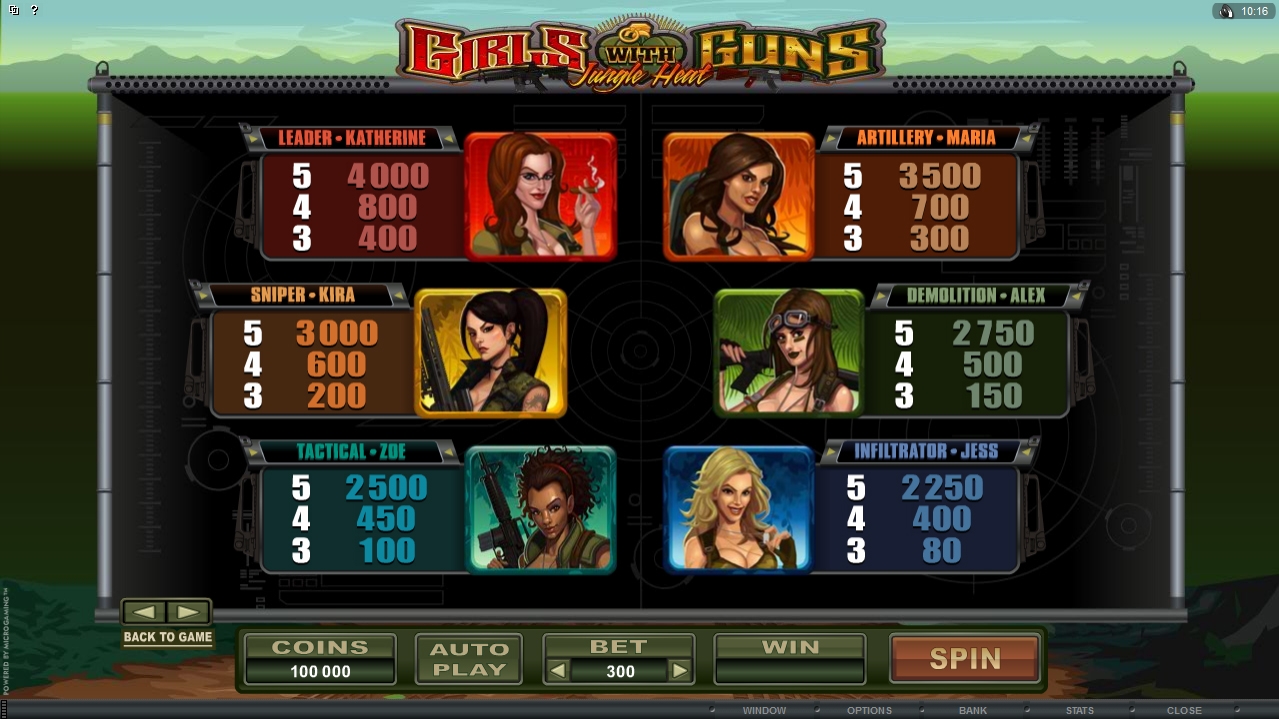 Символы с гранатами подарят бесплатные дополнительные спины и обеспечат неплохую порцию адреналина. Girls with Guns - Jungle Heat – это многие часы увлекательного и яркого геймплея.