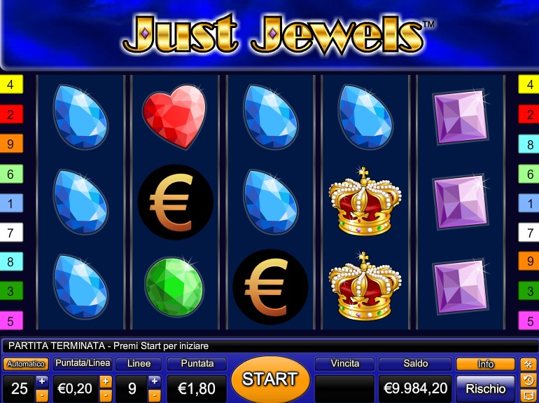 Гаминатор Just Jewels имеет пять барабанов, на которых размещено девять линий выплат, лишь версия Deluxe содержит десять линий. На каждом барабане игровые значки нанесены сериями, посему на протяжении игры барабан частенько оказывается полностью заполненным тем либо иным символом.