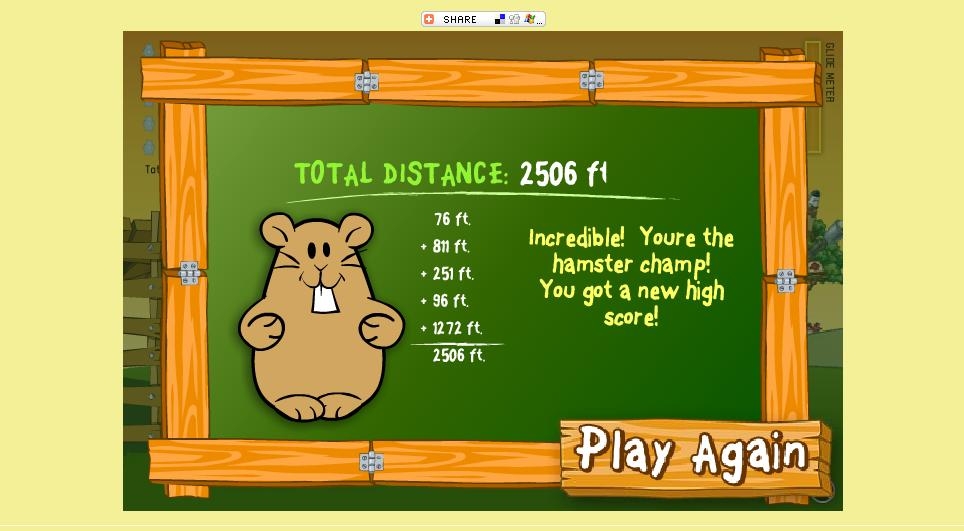 FlightoftheHamsters - это флеш игра, а значит, для ее создания был использован универсальный язык программирования, дающий возможность играть гладко и без непонятных рывков и скачков. Для того, чтобы ваш смелый хомячок отправился в свой славный полет, вам достаточно кликнуть мышкой. В качестве первооткрывателей, для начала вы запускаете парочку друзей хомячка, по очереди друг за другом. Но вот ваш хомяк надел защитные очки пилота и готов к старту. Дальше, вам нужно научиться правильно определять время запуска катапульты, которая, попав по хомячку, собственно, и определяет скорость и дальность полета вашего пушистика. Если удар будет рассчитан верно, ваш хомяк попадет на целую полосу пружин и бонусов, прыгая по которым, грызун будет преодолевать все большее и большее расстояние. Если все препятствия будут пройдены правильно и скорость движения будет достаточной, хомячок достигнет финиша игры, а именно, домика на дереве на противоположном конце двора. Игра, как видите, весьма незамысловата, но достаточно увлекательна, чтобы вы перестали следить за временем и окружающим миром.